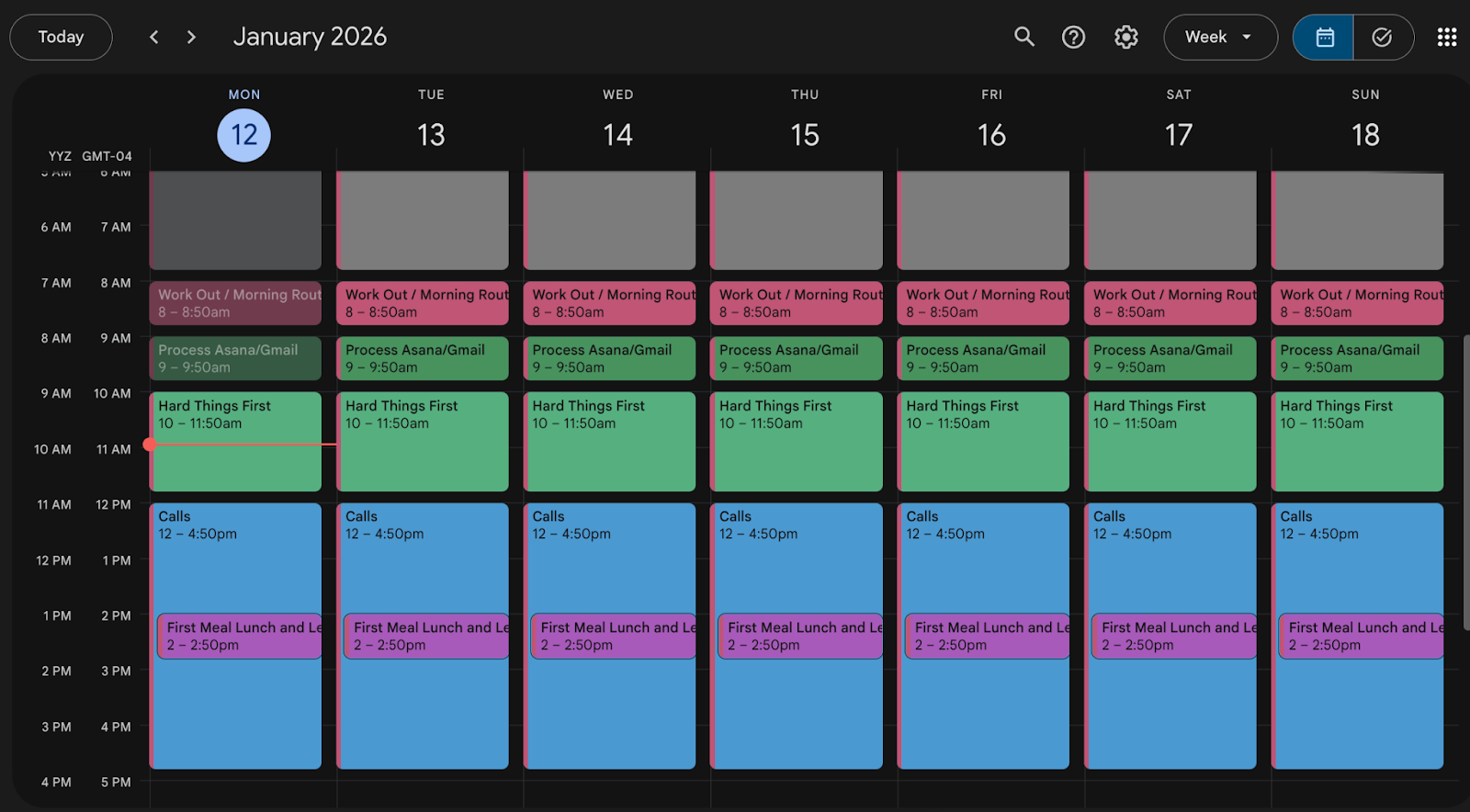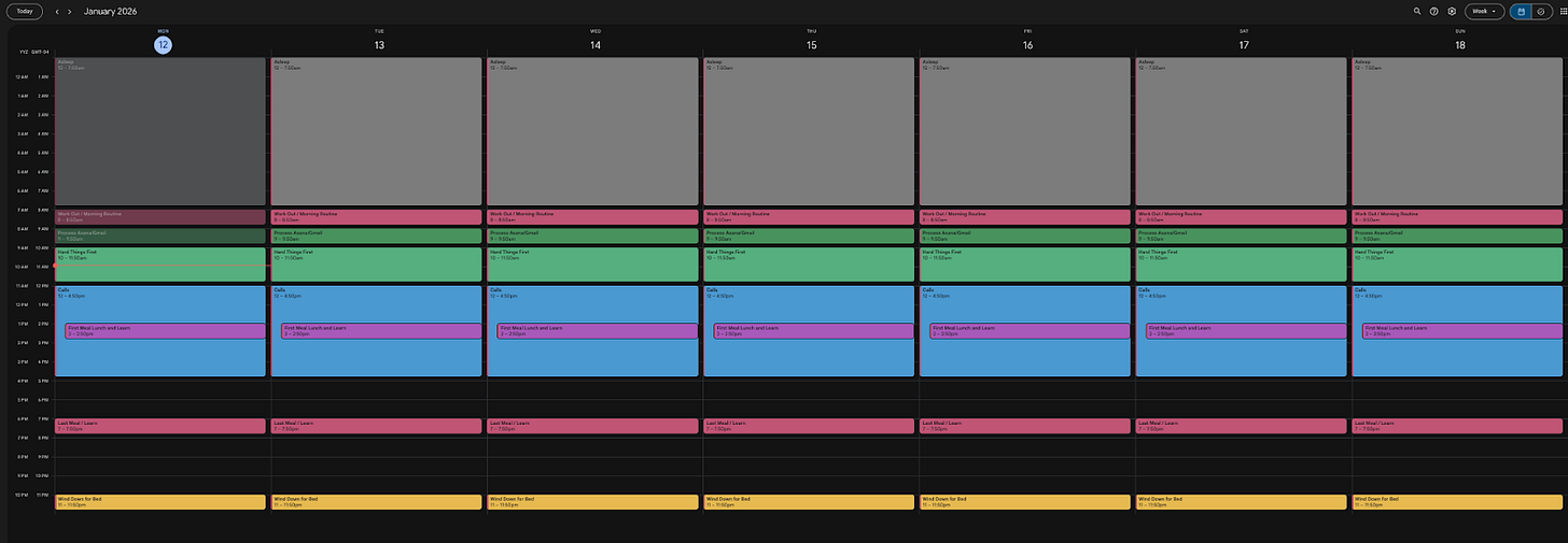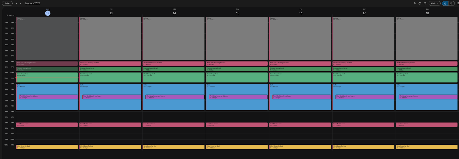 He pulled up his calendar architecture: a custom visual system that serves as the key to his productivity.